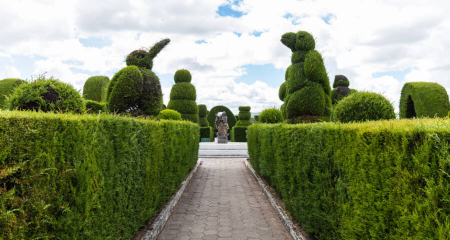 گروئرو با استفاده از پرچینهای متراکم و توپیاریهای بلند، زمین قبرستان را به یک هزارتو تبدیل کرده است. علاوه بر اشکال هندسی، او مجسمههایی با الهام از نمادهای اینکا، پیش از کلمبیا و عربی نیز خلق کرده است. این مجموعه بیش از 300 مجسمه اساطیری و سنتی را در خود جای داده است.